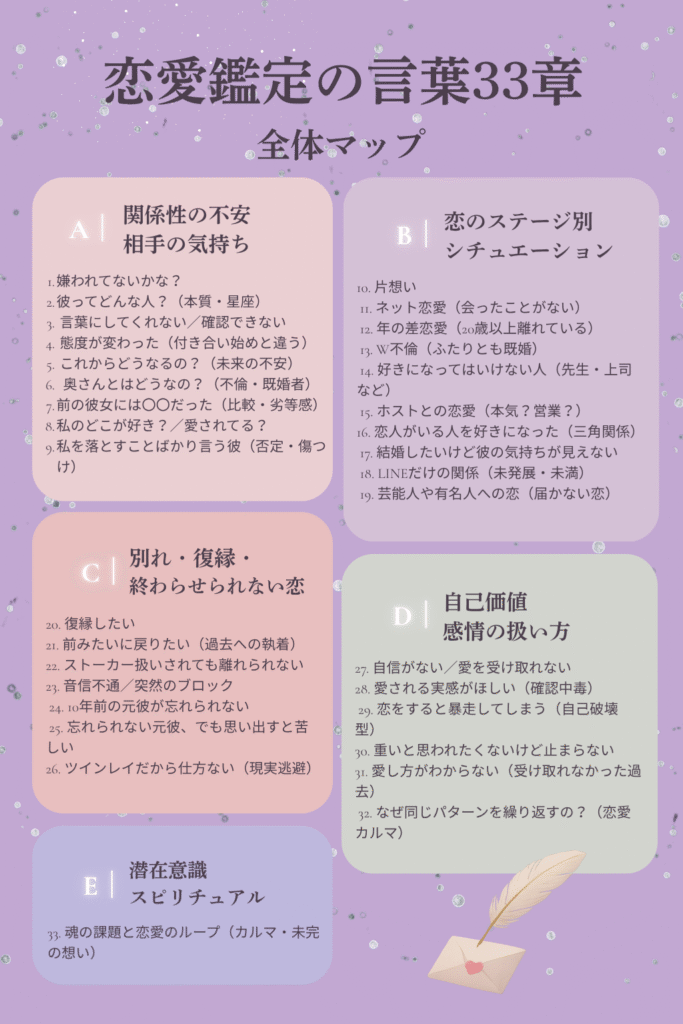 < 恋愛鑑定の“言葉の地図”——33の悩み × 届く言葉 >